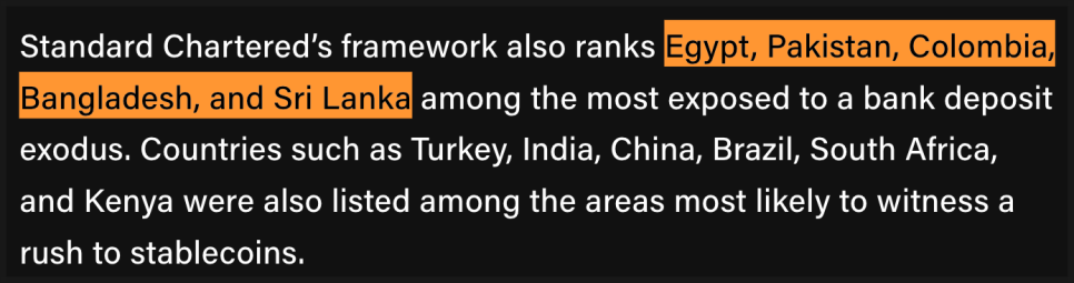 보고서는 특히 이집트, 파키스탄, 콜롬비아, 방글라데시, 스리랑카 등을 예금 이탈 위험이 높은 국가로 꼽았습니다. 또한 터키, 인도, 중국, 브라질, 남아프리카공화국, 케냐 역시 스테이블코인으로 자금이 빠져나갈 가능성이 높은 지역으로 분석했습니다.