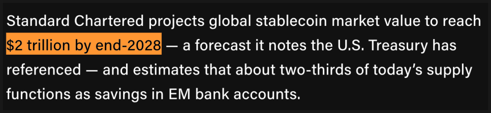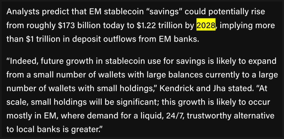 스탠다드차타드는 현재 약 1,730억 달러 규모의 신흥국 스테이블코인 저축금(savings) 이 2028년에는 1조 2,200억 달러로 증가할 것이라고 예측했습니다. 약 1조 달러 규모의 예금이 은행 시스템에서 스테이블코인으로 이동한다는 뜻입니다.