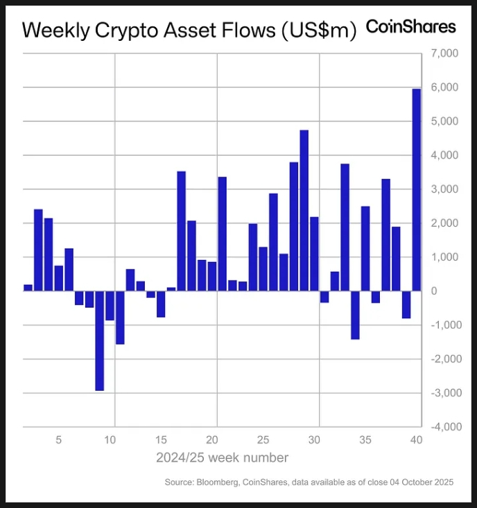 글로벌 자산운용사 코인셰어스(CoinShares)에 따르면, 지난주 전 세계 암호화폐 투자 상품으로 59억 5천만 달러(약 8조 원)가 순유입되며 사상 최대 기록을 세웠습니다.