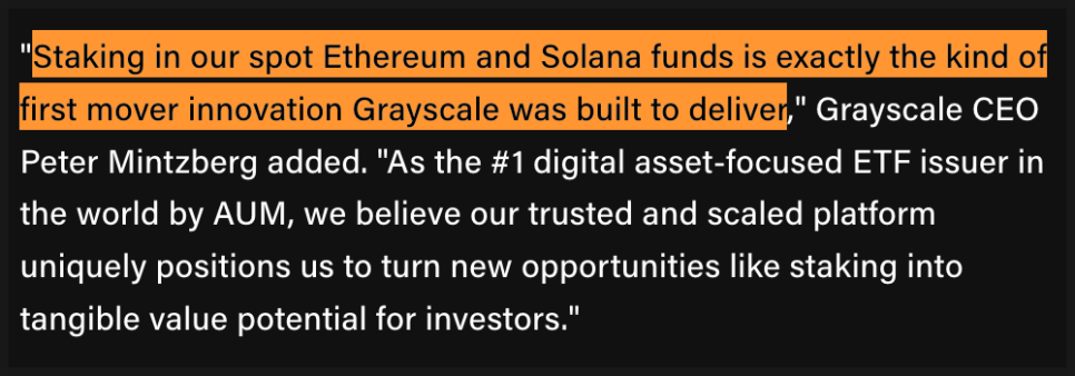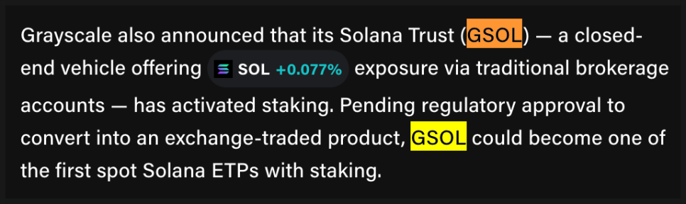 그레이스케일은 솔라나 트러스트(GSOL)에도 스테이킹 기능을 활성화했습니다. 앞으로는 다른 상품에도 점진적으로 확대할 계획이라고 밝혔습니다.