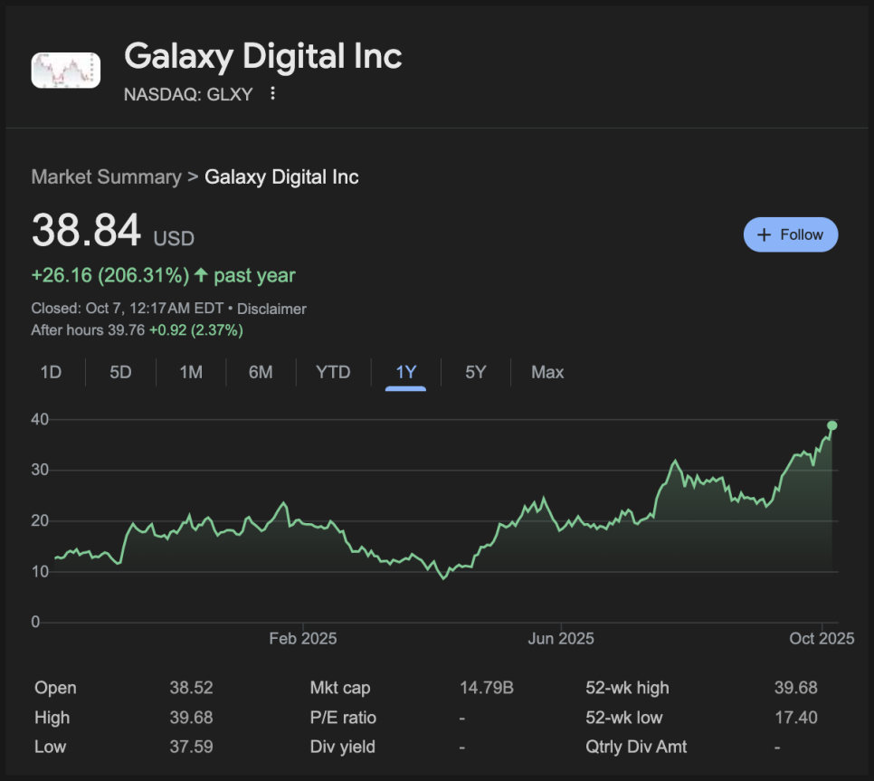 참고로 갤럭시 디지털 주가는 지난 1년 간 200% 상승했습니다.