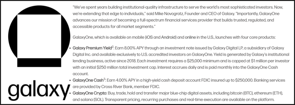 또한 일반 사용자는 연 4% 이자율의 예금 계좌를, 소득 기준을 충족한 고액 투자자는 연 8% 수익률의 고수익 노트 상품에 투자할 수 있습니다. 이 상품은 은행 예금처럼 FDIC 보장 대상은 아니지만, 갤럭시의 대출사업 수익으로 뒷받침되는 구조입니다.