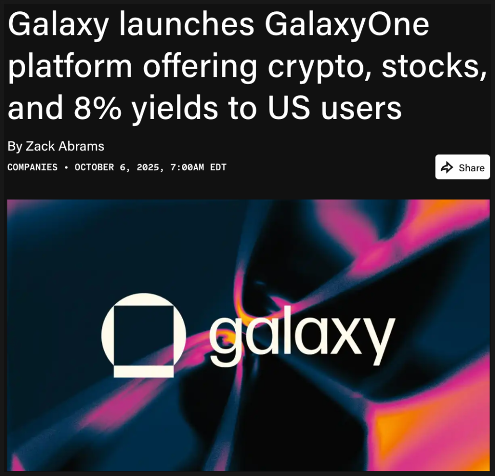 이번 주에는 또 하나의 상징적인 뉴스가 있었습니다. 바로 암호화폐 금융기업 갤럭시 디지털(Galaxy Digital)이 새롭게 선보인 ‘갤럭시원(GalaxyOne)’ 플랫폼입니다.