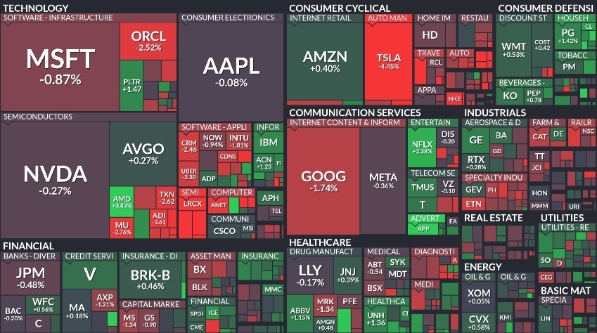 기술주 중심의 약세가 두드러졌습니다. 테슬라(-4.45%)가 크게 하락했고 마이크로소프트와 구글도 각각 -0.87%, -1.74% 하락했습니다. 반면 브로드컴과 아마존은 소폭 상승하며 기술 내에서도 차별화가 나타났습니다. 반도체, 통신, 금융 전반에서 혼조세가 이어지며 투자자들은 금리 경로와 달러 흐름에 주목하고 있습니다.