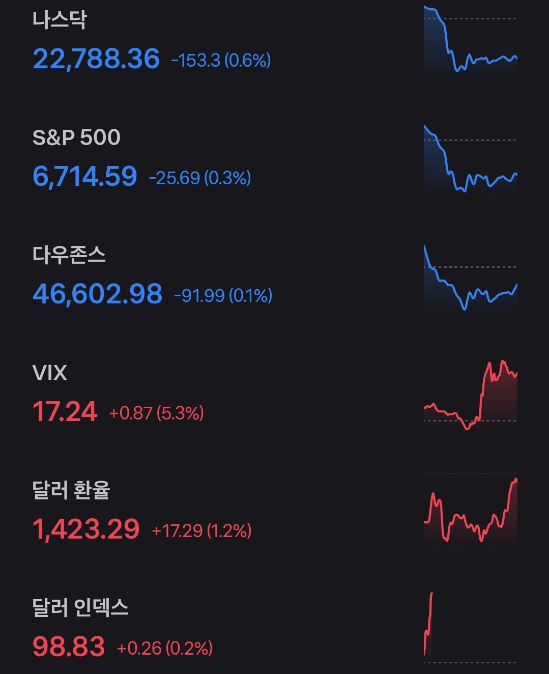 나스닥은 0.6% 하락, S&P500은 0.3% 하락, 다우지수는 0.1% 하락하며 3대 지수 모두 약세로 마감했습니다. VIX 지수는 17.24로 5% 넘게 상승했고 이는 단기 변동성 확대를 시사합니다. 환율은 1,423원으로 1.2% 급등했고 달러 인덱스 역시 상승세를 이어갔습니다. 반면 투자심리 지표인 공포탐욕지수는 53으로 중립을 유지해 시장이 ‘과열은 아니지만 불안정한 균형 상태’임을 보여주고 있습니다.
