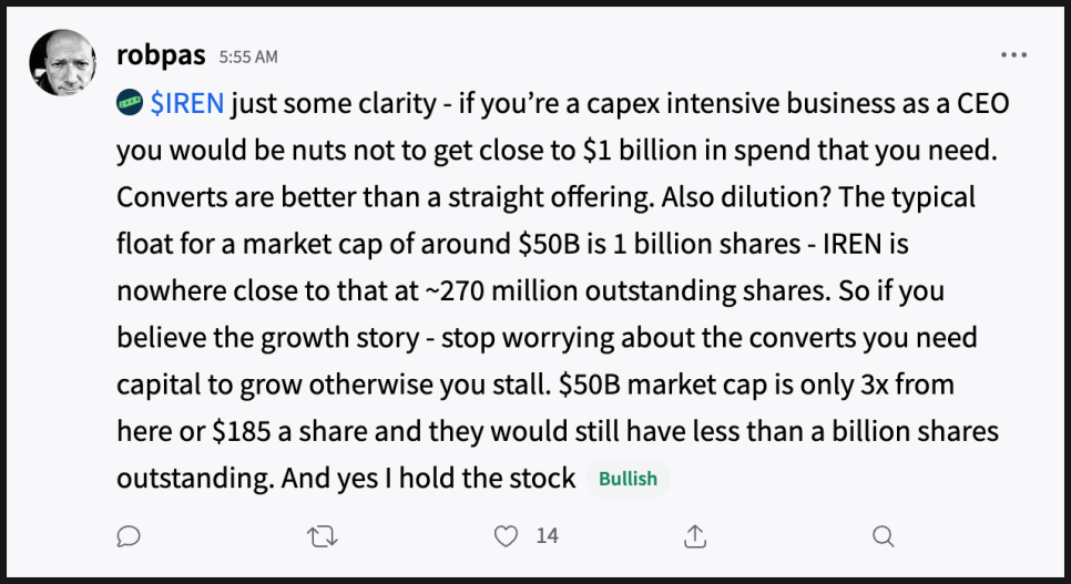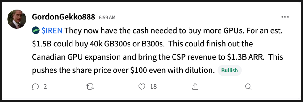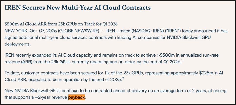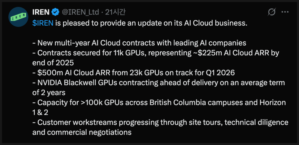 이것이 실현된다면, IREN은 2026년에는 완전히 AI 중심 기업으로 자리잡게 될 가능성이 높습니다.