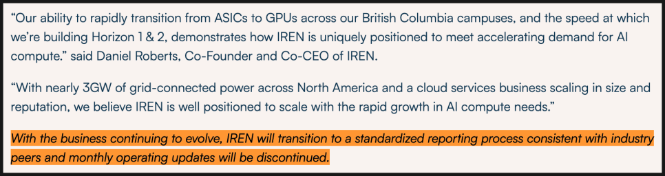 흥미롭게도 아이렌은 이번 발표와 함께 매달 발표하던 비트코인 채굴 실적 보고서를 중단하겠다고 밝혔습니다.
