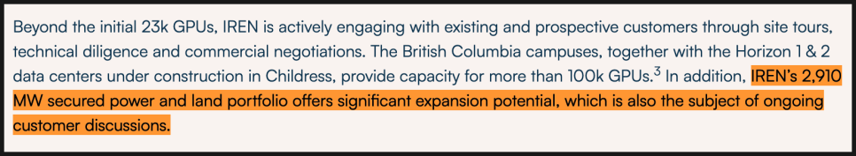 또한, IREN이 확보한 2.9GW(기가와트) 규모의 전력 인프라가