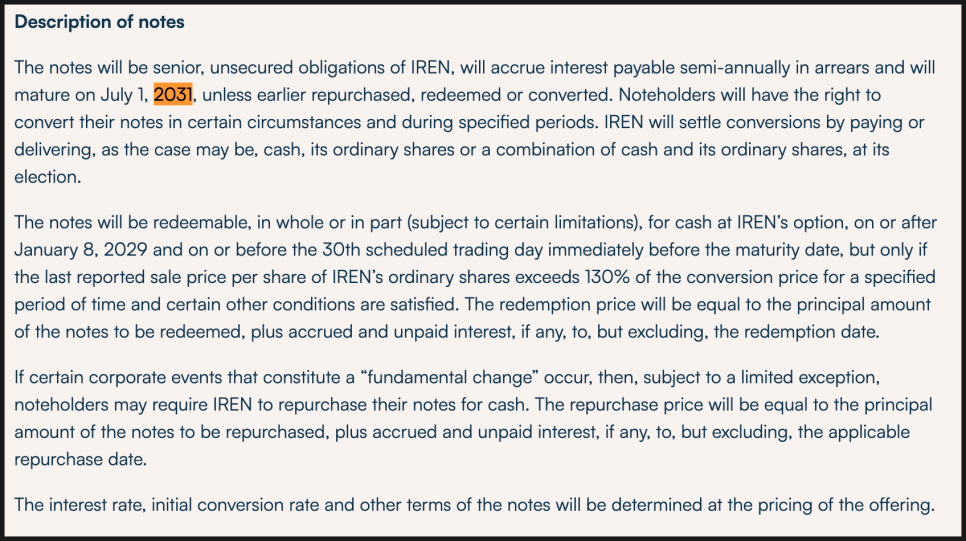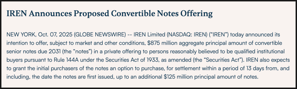 그래서 IREN은 총 8억 7,500만 달러 규모의 전환사채(Convertible Notes) 발행을 결정했습니다.