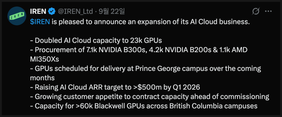 AI 데이터센터 사업으로 전환한 비트코인 채굴 기업 아이렌(IREN)이 최근 두 가지 중요한 발표를 했습니다.