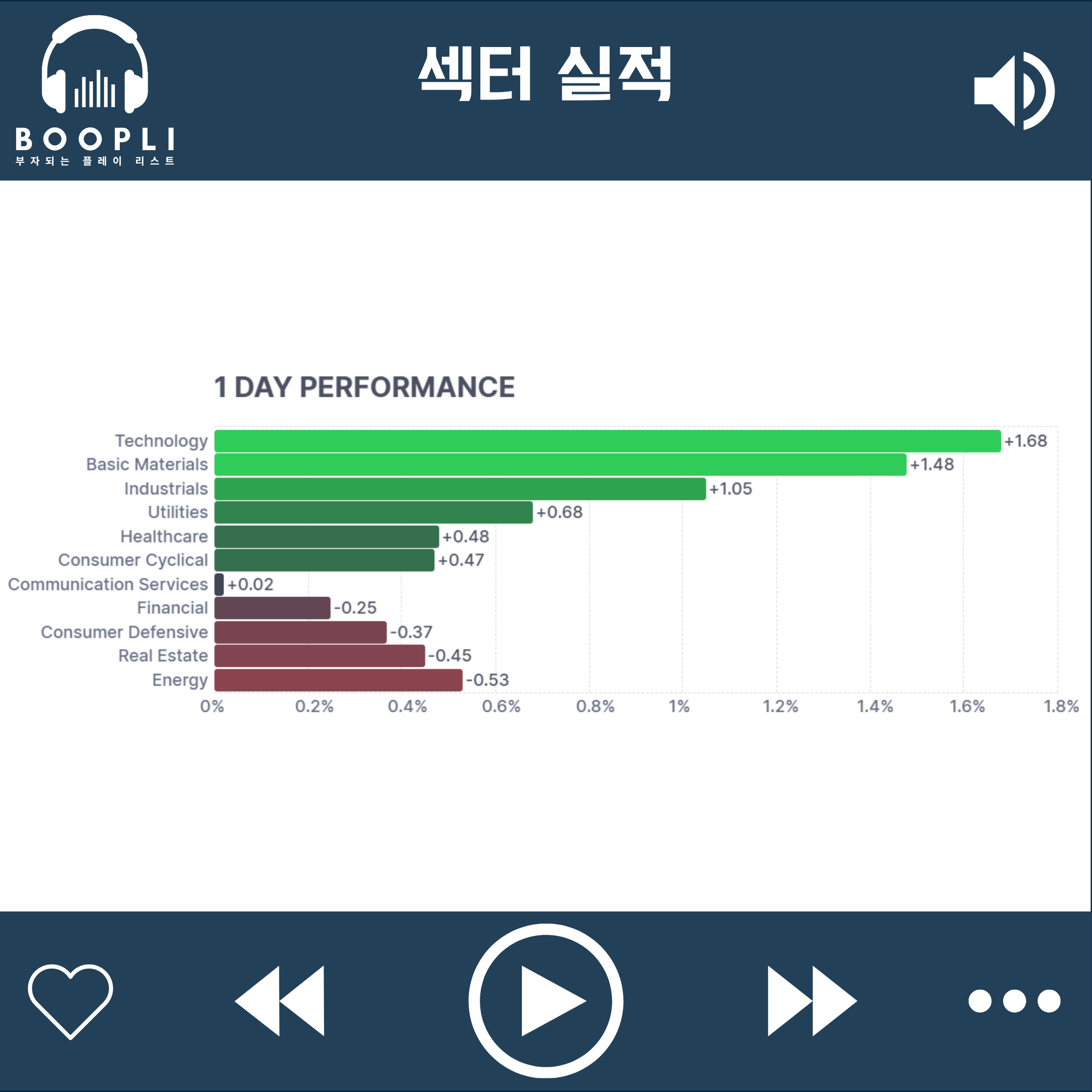젠슨 황 엔비디아 CEO의 발언으로 AI 강세 심리가 회복되면서 기술주가 상승 주도, 이어서 원자재, 산업재, 유틸리티 순으로 강세