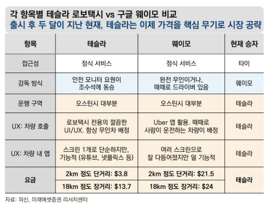 오스틴에서의 로보택시 서비스를 비교해보면, 앱 자체도 테슬라가 훨씬 쉽고 간편하며 하드웨어, 소프트웨어, 차량 내부 환경이 테슬라가 더 좋고, 가장 중요한 가격은 비교 불가능한 수준입니다.