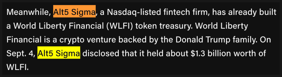 흥미로운 점은, 이런 ‘정치 코인’ 프로젝트가 점점 제도권 금융 구조를 모방하고 있다는 것입니다. 실제로 나스닥 상장사 알트5 시그마(Alt5 Sigma)도 최근 트럼프 가족이 관여한 월드 리버티 파이낸셜(WLFI) 프로젝트를 통해 13억 달러 규모의 토큰 자산을 보유하고 있다고 공개했습니다.