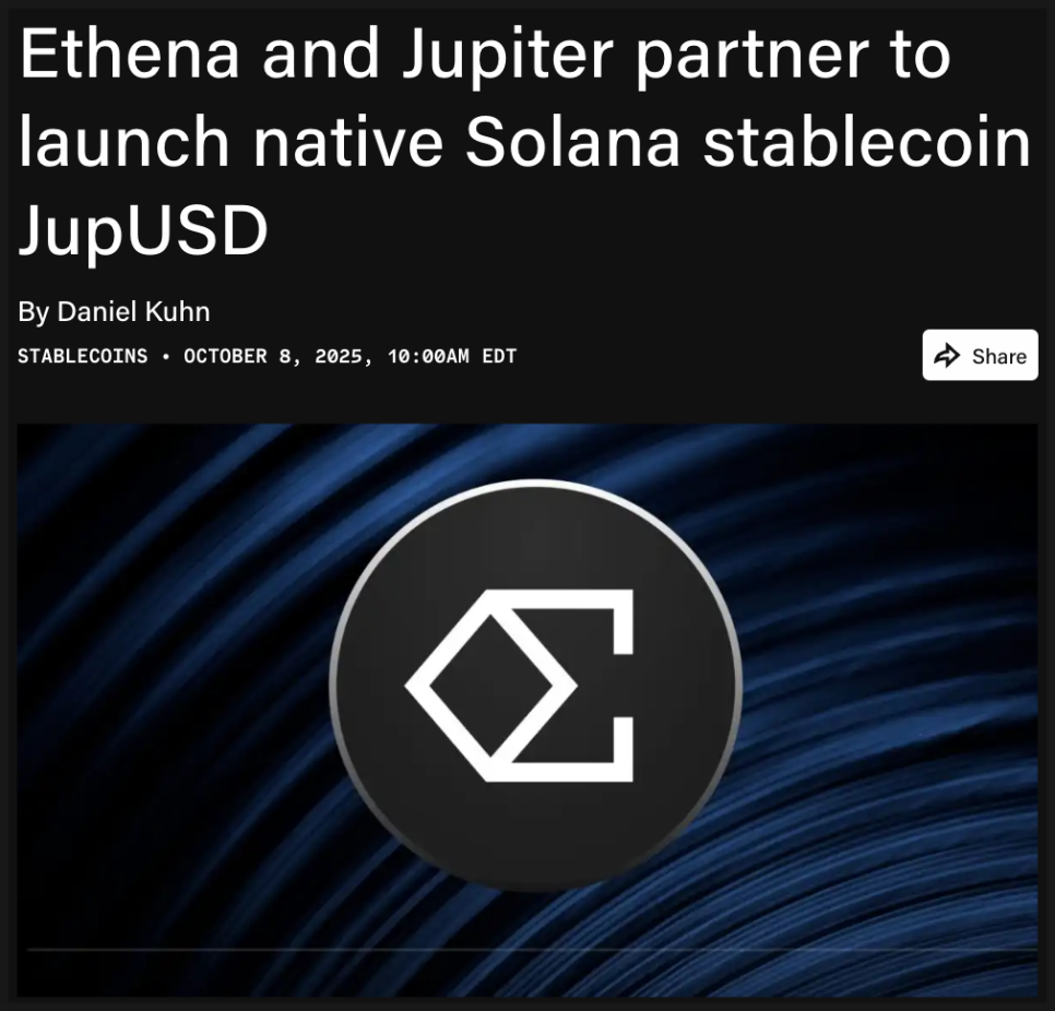 이번 주 암호화폐 시장에서 가장 큰 화제 중 하나는 이세나 랩스(Ethena Labs)와 주피터(Jupiter)가 손잡고 선보이는 JupUSD입니다. JupUSD는 솔라나(Solana) 블록체인 기반의 새로운 스테이블코인으로, 오는 4분기 출시가 예정되어 있습니다.