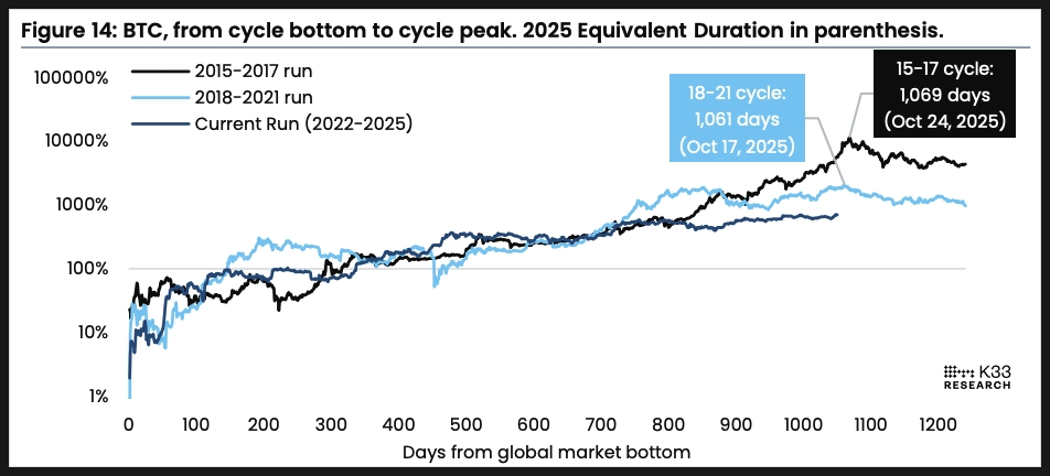 일각에서는 과거 사이클과 비교해 이번 상승장이 사이클 정점에 가까워졌다고 주장합니다. 2022년 11월 저점 이후 현재까지 1,051일이 지났는데, 과거 상승장 주기와 거의 일치하기 때문입니다.