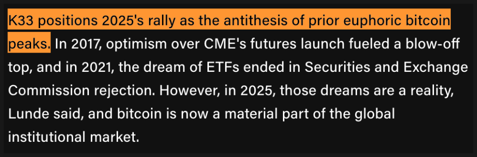 K33는 이번 상승장이 과거 강세장과 본질적으로 다르다고 강조합니다.