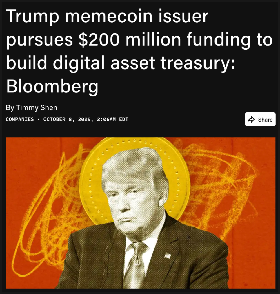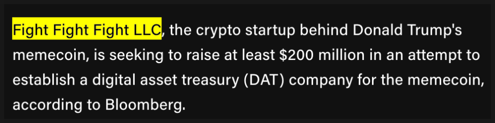이번 주에는 다소 엉뚱하지만 흥미로운 소식도 있었습니다. 바로 도널드 트럼프 대통령의 밈코인 발행사가 2억 달러 이상 규모의 디지털 자산 금고(DAT, Digital Asset Treasury) 설립을 추진 중이라는 소식입니다.