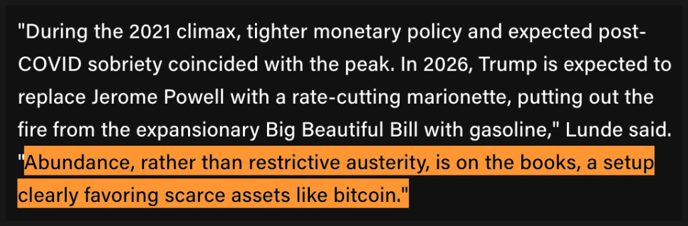 룬데는 “2021년 정점 당시에는 긴축 통화정책이 불안을 키웠지만, 2026년에는 정반대 상황이 펼쳐질 것”이라고 내다봤습니다. 그는 “트럼프 대통령이 제롬 파월 연준 의장을 대체할 인물을 임명하고, ‘빅 뷰티풀 빌(Big Beautiful Bill)’로 불리는 대규모 확장 정책에 유동성을 더할 가능성이 높다”며, “긴축이 아니라 풍요의 시대가 올 것”이라고 설명했습니다. 이런 환경은 금이나 비트코인처럼 공급이 제한된 자산에 유리하게 작용할 가능성이 크다는 거죠.