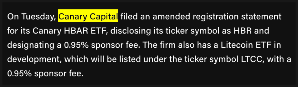 최근 카나리 캐피털(Canary Capital)이 HBAR ETF와 라이트코인 ETF의 세부 정보를 포함한 수정 등록서를 제출했습니다. 여기에는 각각의 티커(symbol)와 운용 수수료(0.95%)가 명시되어 있었는데요, 이 같은 세부사항은 보통 승인 직전 단계에서만 공개된다고 합니다.