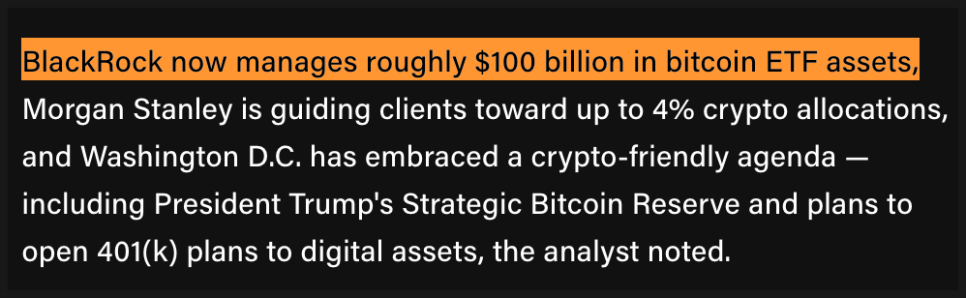 특히 블랙록은 비트코인 ETF 자산만 약 1,000억 달러를 운용하고 있으며, 모건스탠리나 웰스파고 같은 대형 은행도 고객들에게 포트폴리오 내 비중을 4%까지 확대하도록 권장하고 있습니다. 워싱턴 D.C.도 친(親) 암호화폐 기조를 강화하고 있는데요. 트럼프 행정부는 비트코인 전략 비축 제도(Strategic Bitcoin Reserve)와 401(k) 퇴직연금에 디지털 자산을 포함하는 방안을 추진하고 있습니다.