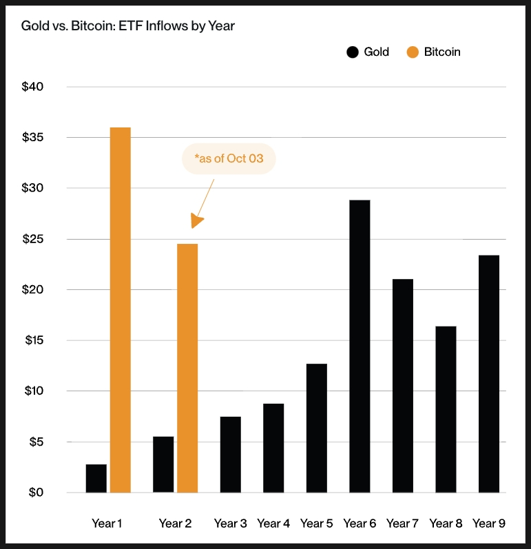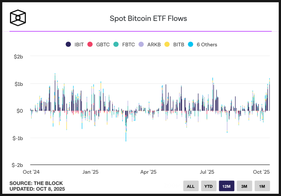 실제로 10월 첫 4거래일 동안 비트코인 ETF에는 35억 달러가 유입되었고, 이어진 화요일 하루 동안에도 8억 7,500만 달러가 추가로 들어왔습니다. 블랙록의 IBIT ETF는 단 하루에 8억 9,900만 달러를 끌어모으며 가장 큰 수혜를 봤습니다.