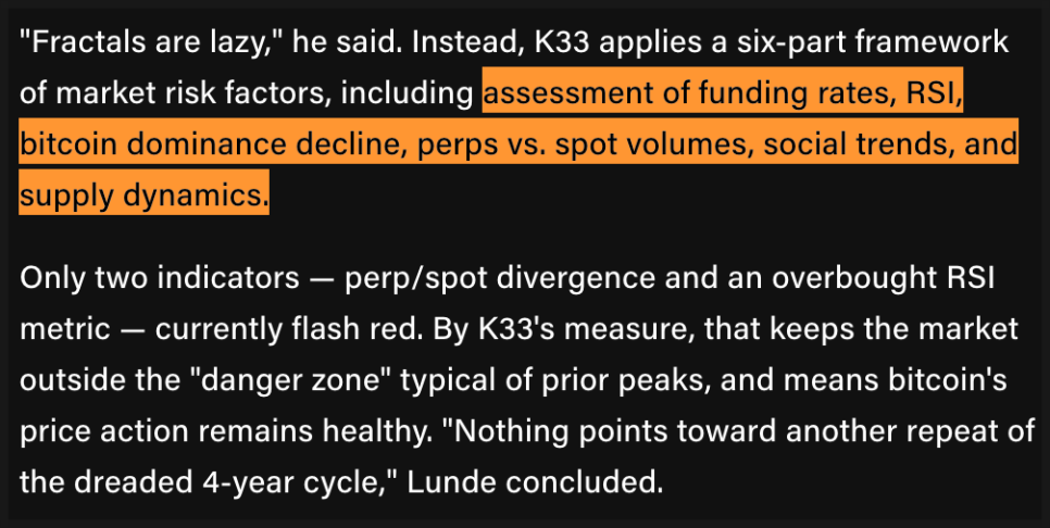 K33는 현재 시장을 펀딩비, RSI(과매수 지표), 비트코인 점유율 변화, 파생상품과 현물 거래 비중, 소셜 트렌드, 공급 동향, 이렇게 여섯 가지 지표로 분석하고 있는데, 이 중 과열 신호를 보이는 건 RSI와 파생상품-현물 괴리율 두 가지뿐이라고 합니다. 즉, 전반적인 구조는 “건전하다”는 거고 현재 시장은 과거와 달리 전형적인 고점 국면에 있지 않다는 분석인데요. 룬데는 “지금 상황은 4년 주기가 지배하던 과거 시장과 전혀 다르다”며 “가격 흐름은 건강하고 구조적”이라고 결론지었습니다.ㅊ“과거의 주기를 반복할 조짐은 없다”고 단언했죠.