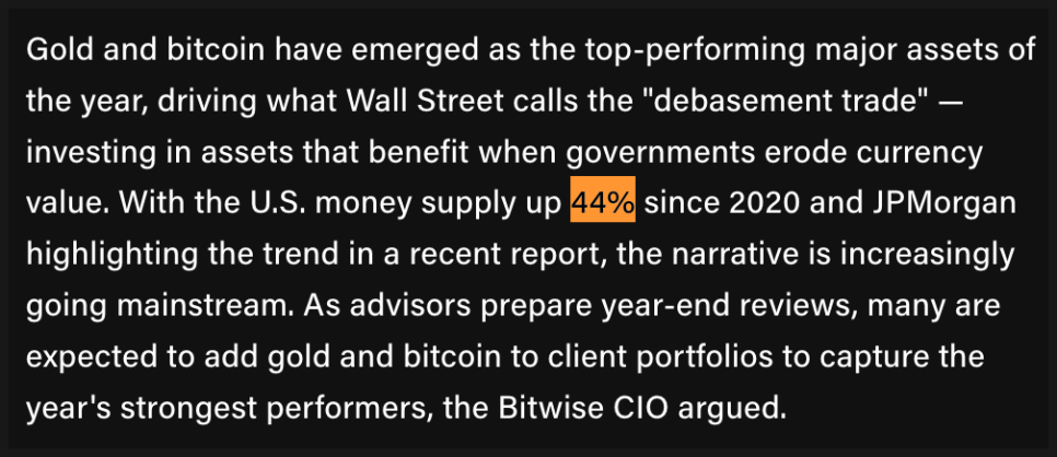 2020년 이후 미국의 통화 공급량은 약 44% 증가했는데요. 이런 상황에서 현금보다 ‘가치가 희소한 자산’인 금과 비트코인이 다시 주목받고 있습니다.