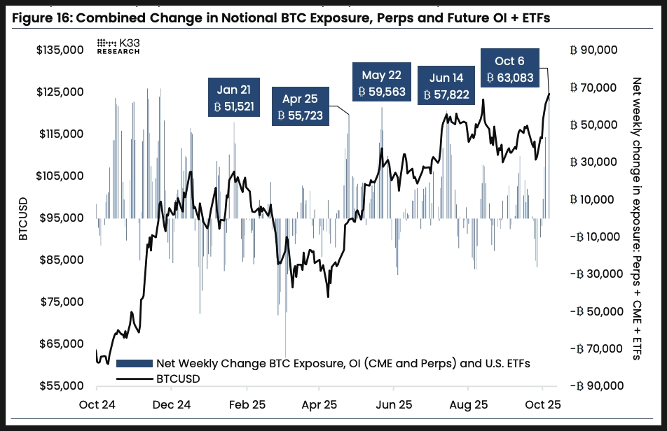 룬데는 단기적으로 과열 신호가 일부 존재한다는 점은 인정했습니다. 실제로 최근 일주일 동안 ETF 및 파생상품을 통한 비트코인 노출 규모가 6만 3천 BTC(약 77억 5천만 달러)나 증가했습니다. 2025년 들어 가장 큰 폭의 순유입입니다.