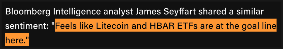그럼에도 불구하고 전문가들은 낙관적입니다. 제임스 세이퍼트(James Seyffart) 애널리스트는 “라이트코인과 HBAR ETF는 거의 결승선에 와 있다”고 분석했습니다.