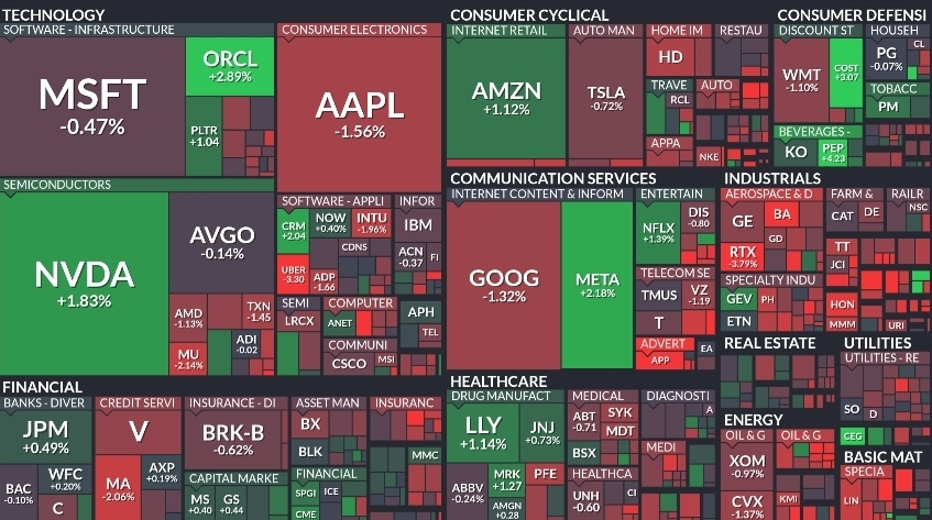 지수는 혼조로 마감했습니다. 대형 기술주 중 일부는 강세를 보였으나 플랫폼과 일부 메가캡에서는 차익 실현이 나오며 섹터 내 분화가 확대되었습니다. 반도체에서는 AI 가속기와 설계 생태계 관련 종목의 수급이 상대적으로 견조 했고 방산과 에너지 대형주는 약세를 보이며 경기 민감 섹터의 조정 폭이 컸습니다. 금융주는 실적 시즌을 앞두고 배당과 순이자마진 기대가 교차해 종목별 성과가 엇갈렸습니다.