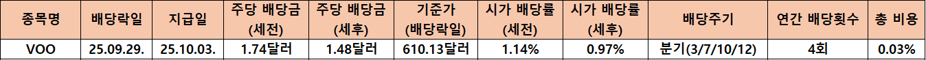저 역시 VOO의 배당이 매 분기 성장하는 모습을 긍정적으로 평가하지만 이 ETF의 핵심은 주가 상승이라는 점을 다시 한번 강조하고 싶습니다. 장기적으로 보면 배당 현황에 일희일비할 필요가 없으며 오히려 배당은 꾸준한 성장의 증거로 받아들이는 것이 바람직합니다. 이처럼 VOO는 미국 시장의 평균 성과를 그대로 반영하면서도 안정적이고 예측 가능한 배당을 제공하는 ETF로서 장기투자자에게 여전히 매력적인 선택지임이 분명합니다.