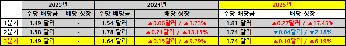 이번 2025년 3분기 배당금은 주당 1.74달러(세전)로 확정되었고 시가 배당률은 1.14% 수준이었습니다. 세후 기준으로는 1.48달러, 실질 배당률은 약 0.97%로 나타났습니다. 이 수치만 보면 배당 매력은 다소 낮게 느껴질 수 있지만 연간으로는 여전히 분기 배당 4회를 꾸준히 지급하며 안정적인 배당 이력을 이어가고 있습니다.