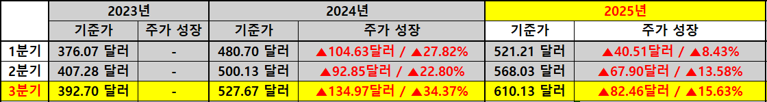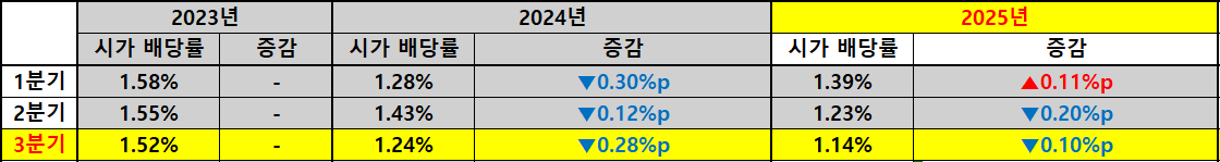 주가 측면에서 보면 VOO의 성장은 배당 성장보다 훨씬 가파르게 진행되고 있습니다. 2024년 한 해 동안 주가는 평균 약 30% 이상 상승했고 2025년 들어서도 3분기까지 누적 15% 이상 상승했습니다. 이처럼 주가 상승세가 워낙 강하다 보니 배당금이 증가해도 시가 배당률은 오히려 하락하는 모습을 보입니다. 실제로 2023년 3분기 1.52%였던 시가 배당률이 2025년 동일 분기에는 1.14%로 낮아졌는데요, 이는 주가 상승률이 배당 성장률을 크게 상회했다는 뜻입니다.