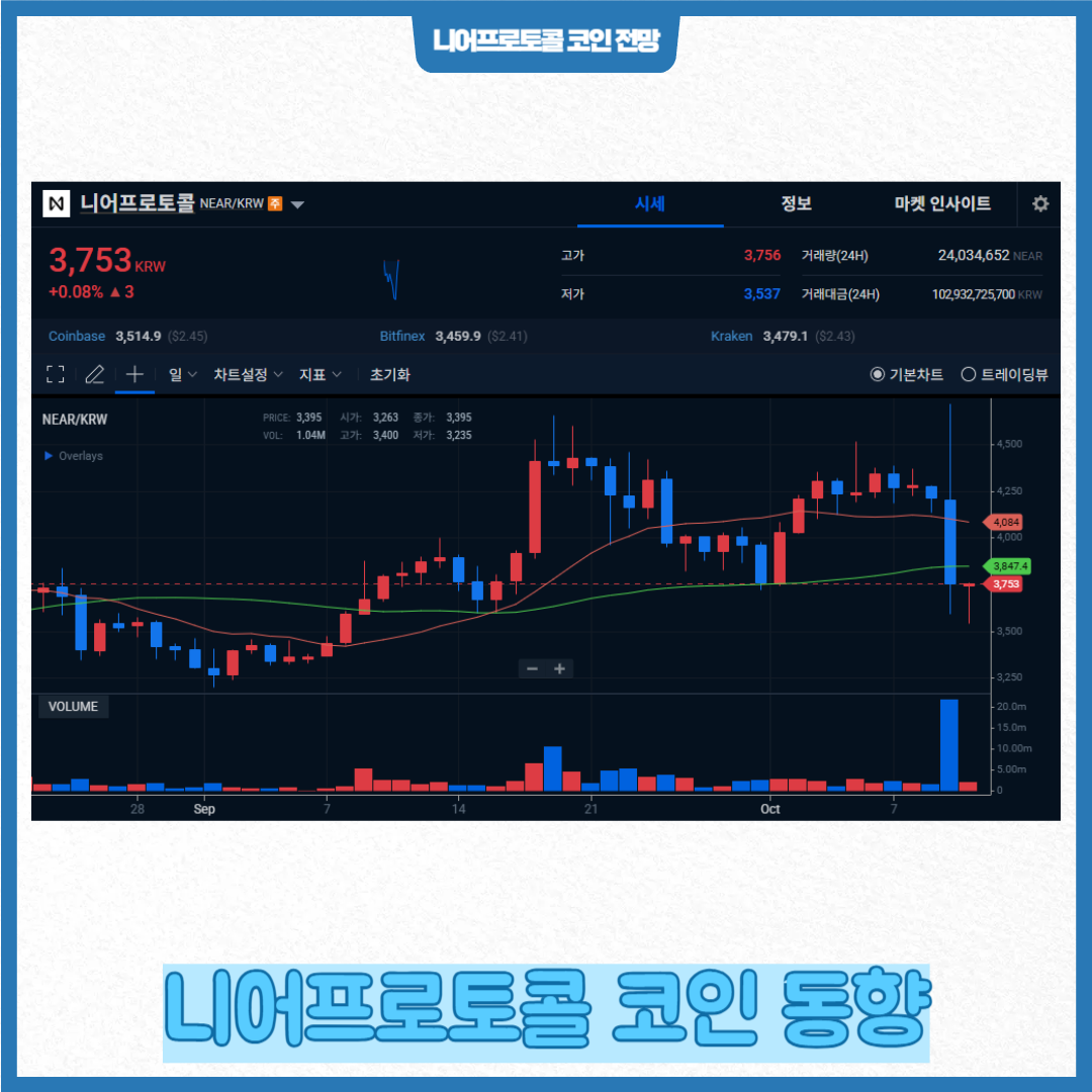 니어는 업비트, 바이낸스, 코인베이스 등 주요 글로벌 거래소에 모두 상장되어 있으며,