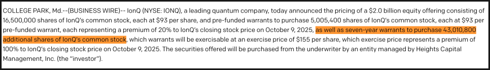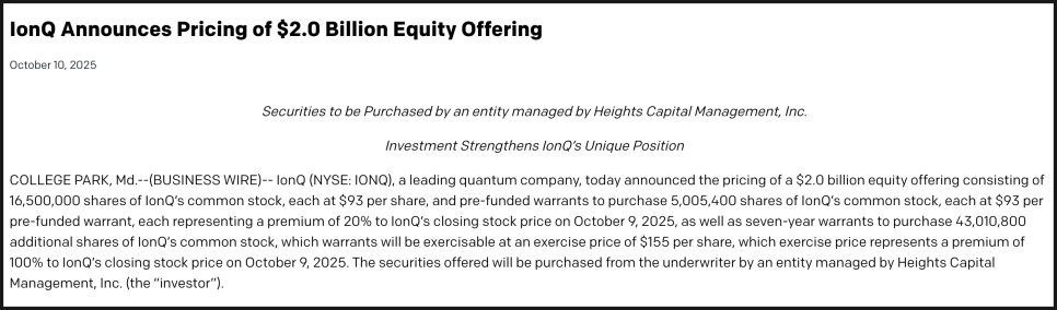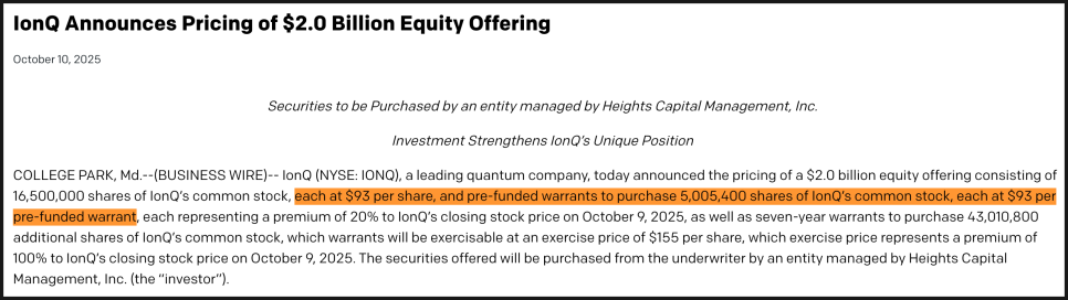 이번 투자 소식의 핵심은 바로 ‘에쿼티 오퍼링(equity offering)’입니다. 쉽게 말해 회사가 새 주식을 발행해 투자자에게 판매함으로써 자금을 조달하는 방식인데요. 아이온큐는 주당 93달러에 보통주 1,650만 주를 발행했고, 여기에 추가로 500만 주 규모의 프리펀디드 워런트(pre-funded warrant)도 발행했습니다. 프리펀디드 워런트란 일정 금액을 미리 지불하고 나중에 주식을 받을 수 있는 일종의 ‘미리 산 주식’ 개념입니다.
