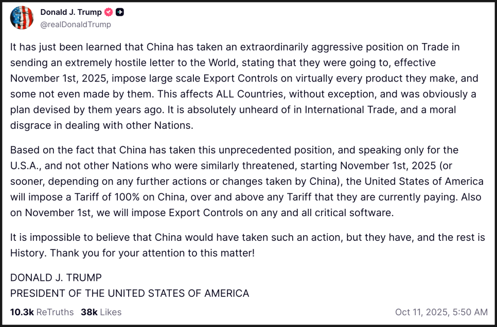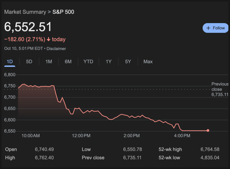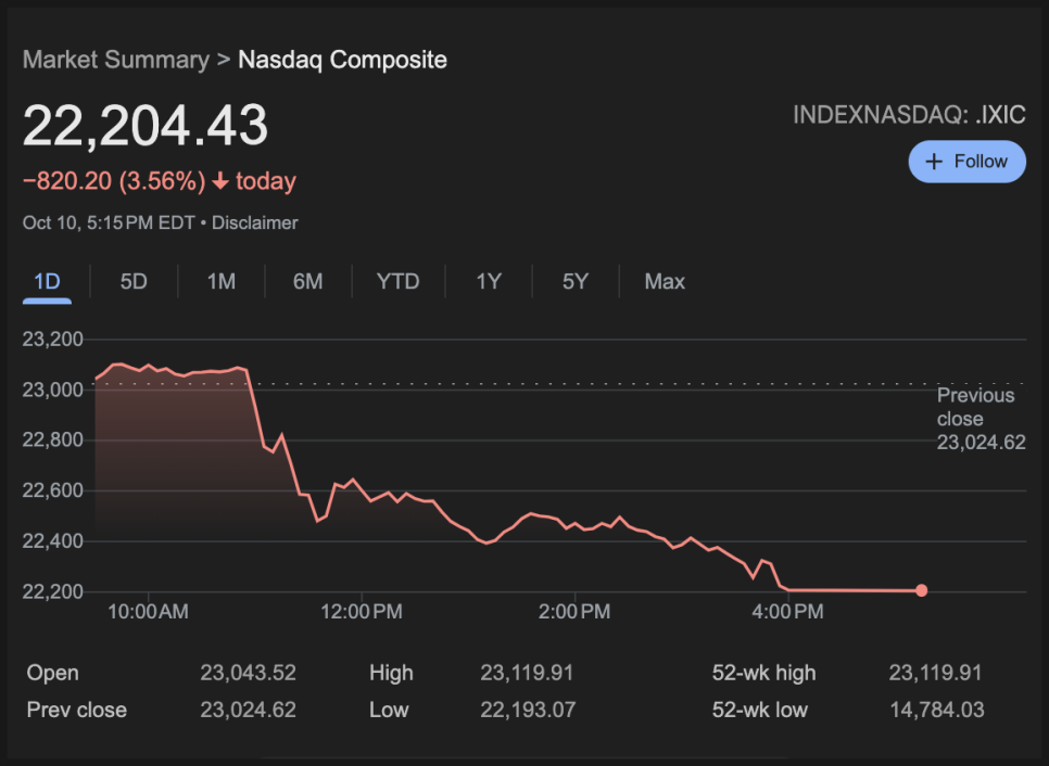 이날 미국 증시는 도널드 트럼프 대통령의 트루스 소셜 발언으로 촉발된 미·중 관세 충돌 우려 때문에 전반적으로 급락했습니다.