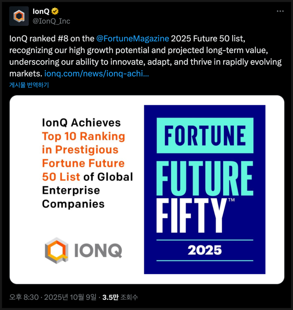 기업 브랜드 가치도 높아지고 있습니다. 아이온큐는 최근 ‘포춘 퓨처 50(Fortune Future 50)’ 리스트에서 8위를 차지하며 전 세계에서 주목받는 성장 기업 반열에 올랐습니다. 이 순위에 이름을 올린 유일한 양자 전문 기업이라는 점에서 상징성이 큽니다. 또한 GITEX 두바이 2025, 이탈리아 ComoLake 2025 등 글로벌 기술 행사에 연이어 참여하며 국제적 입지도 넓혀가고 있습니다.