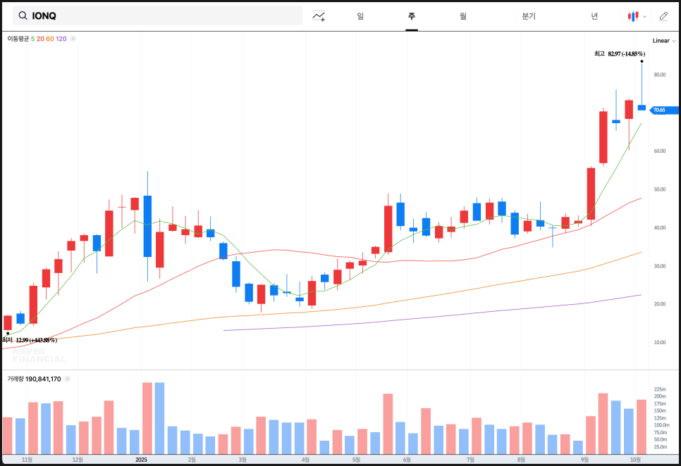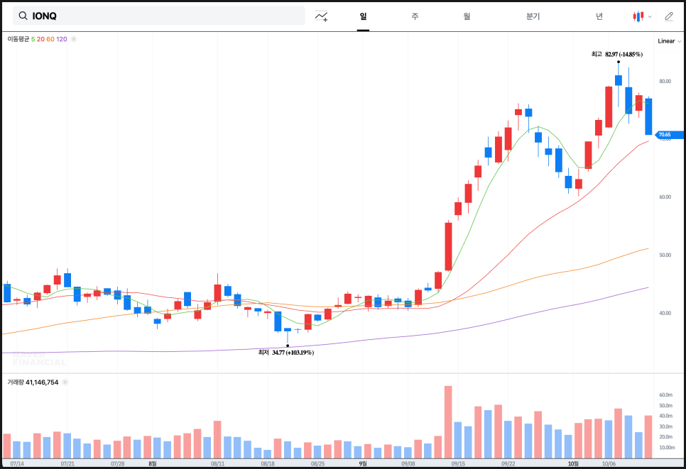일봉 차트를 보면 9월 초 이후 주가가 가파른 상승세를 보이며 단기간에 34달러 부근에서 82.97달러까지 약 140% 가까이 치솟았습니다. 이후 최근 며칠간은 조정 국면으로 접어들었고, 현재 70달러 초반대를 기록하고 있죠.