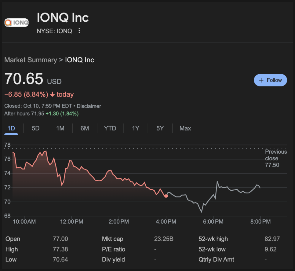 이날 아이온큐 주가는 8% 정도 급락했습니다. 꽤나 큰 폭의 하락인데, 이게 또 어떻게 생각하느냐에 따라 조금 다릅니다.
