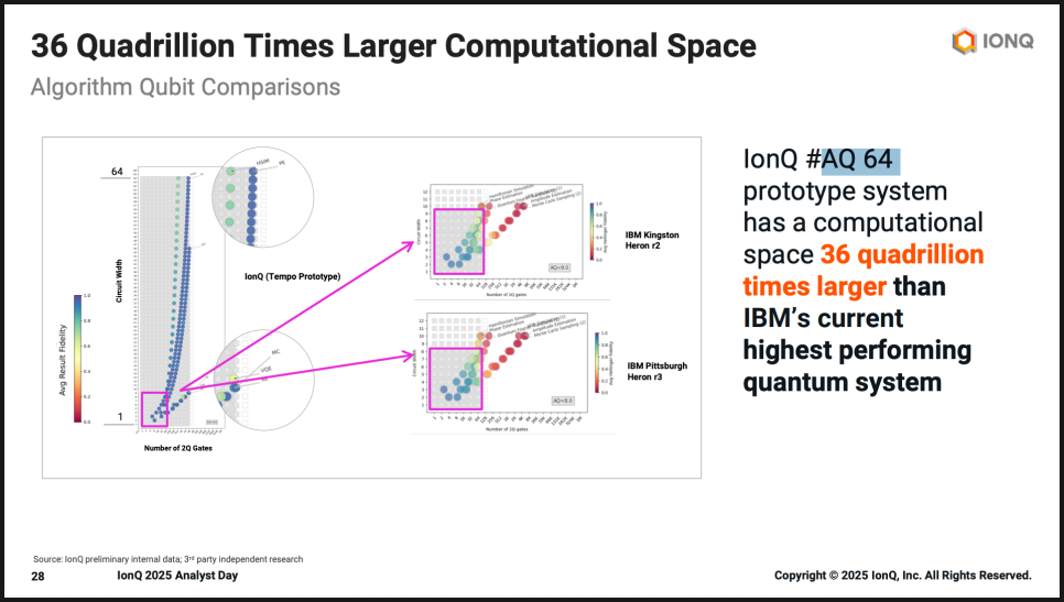 한편 아이온큐는 이미 ‘AQ 64’라는 중요한 성과를 달성했습니다. 이는 양자컴퓨터가 실제 알고리즘을 얼마나 잘 처리할 수 있는지를 측정하는 지표인데요. 숫자가 높을수록 더 복잡하고 실용적인 문제를 풀 수 있는 성능을 의미합니다.