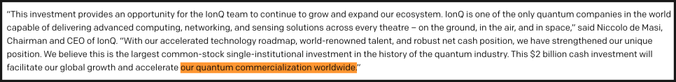 아이온큐의 CEO 니콜로 드 마시(Niccolo de Masi)는 이번 투자에 대해 “이번 자금 유치는 글로벌 성장을 가속화하고 양자 상용화를 앞당길 기회”라고 밝혔습니다. 여기서 중요한 단어는 ‘상용화(commercialization)’입니다.