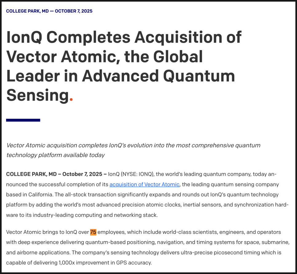 이번 자금 조달만큼 중요한 뉴스가 바로 벡터 아토믹(Vector Atomic) 인수입니다. 아이온큐는 자금 발표 이틀 전, 이 회사를 전액 주식 거래(all-stock deal)로 인수한다고 밝혔습니다. 벡터 아토믹은 양자 센싱(quantum sensing) 분야에서 강력한 기술력을 가진 기업으로, 정밀 원자시계(atomic clock), 관성 센서(inertial sensor), 동기화 하드웨어(synchronization hardware) 등의 분야에서 앞선 기술을 보유하고 있습니다.