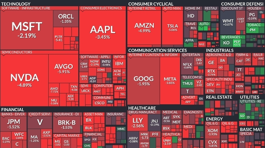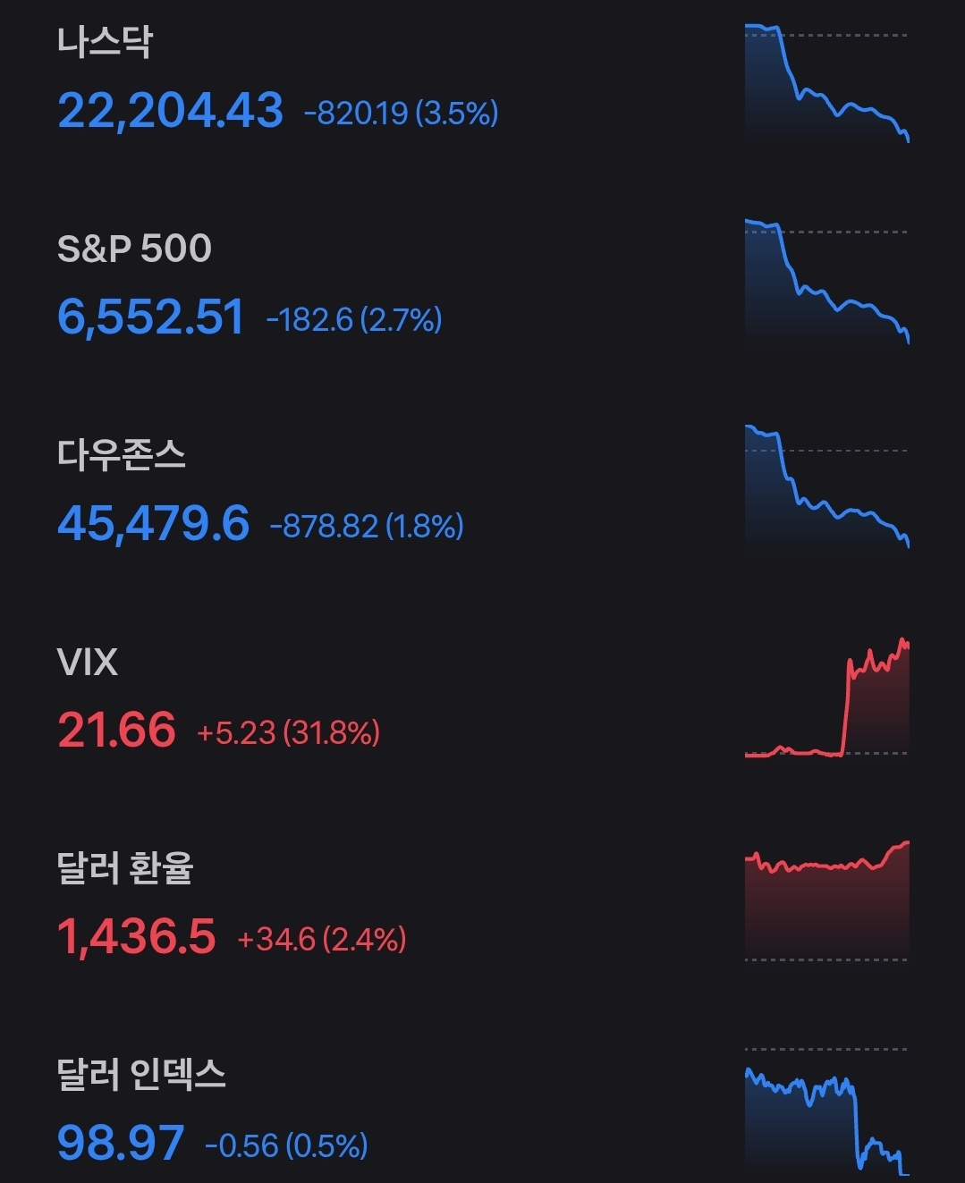 미국 증시는 대형 기술주와 반도체에서 낙폭이 확대되며 주요 지수 하락폭을 키웠습니다. 나스닥은 약 -3.5%, S&P 500은 -2%대, 다우는 -1%대 하락으로 마감했으며 변동성 지수는 급등했습니다. 환율은 1430원대 중반으로 상승했고 달러지수는 단기 반락에도 불구하고 상대 강세 구간을 유지하는 모습입니다. 업종별로는 반도체·소비재 성장주가 약세를 주도했고 일부 필수소비재·유틸리티가 방어력을 보였습니다.