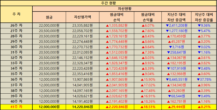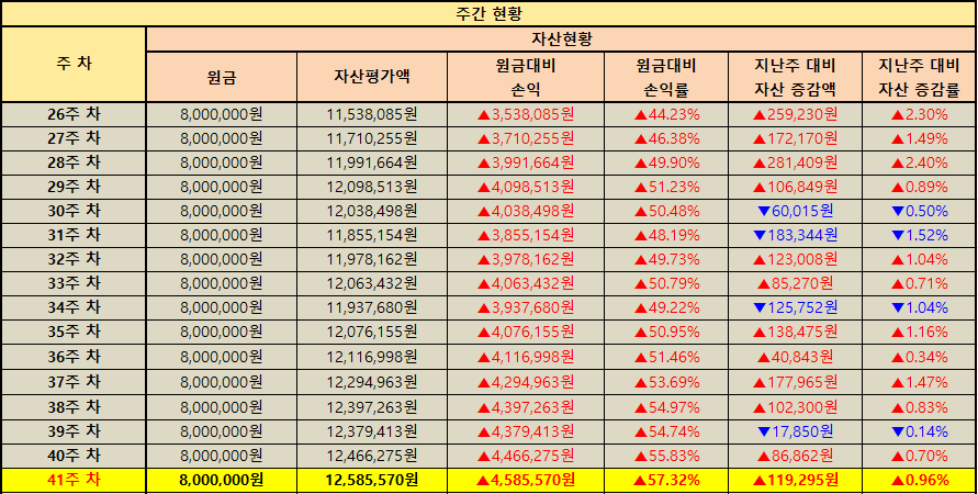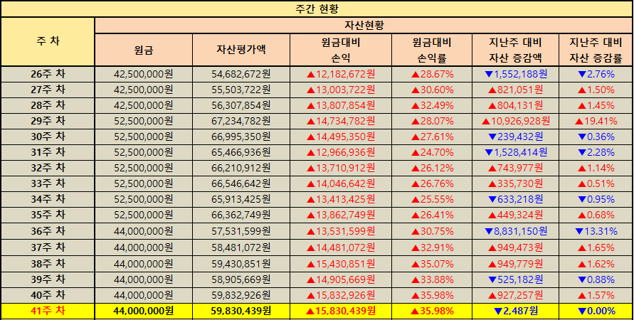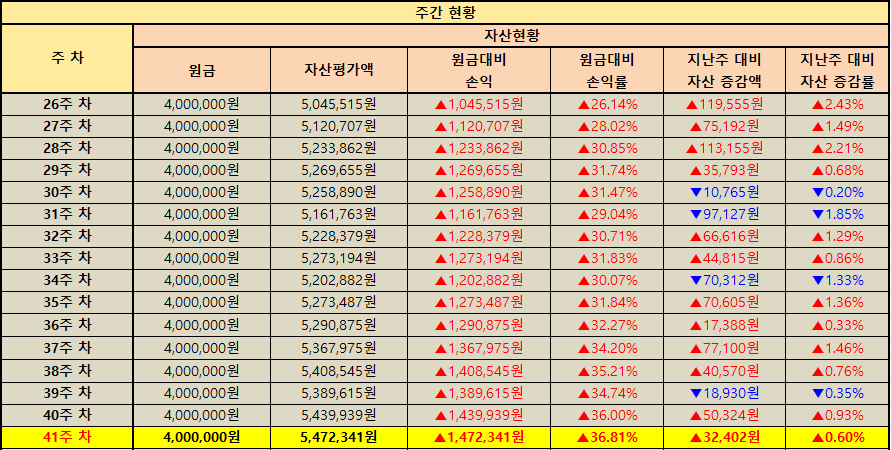 41주 차까지 누적 손익은 +15,830,439원으로 원금 대비 +35.98%의 상승률을 유지 중입니다. 시장이 흔들릴 때마다 일부 계좌는 단기 조정을 받기도 하지만 전체 자산 구조는 꾸준히 우상향하는 복리 곡선을 그리고 있습니다. 연금저축펀드의 안정성과 ISA의 절세 효과, 미국 직투 계좌의 글로벌 분산이 조화를 이루며 장기적으로 균형 잡힌 자산 구조를 유지하고 있죠.