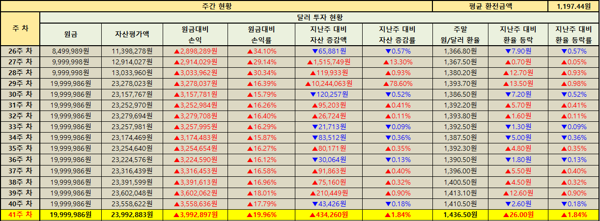 10월의 두 번째 주, 어느덧 올해 41주 차 결산을 맞이하게 되었습니다. 이번 주 시장은 단순한 지수 등락보다도 ‘정치 리스크’의 영향이 더 크게 작용한 한 주였는데요. 미·중 간의 갈등이 다시 부각되면서 글로벌 증시 전반에 긴장감이 감돌았고 특히 미국 증시는 주요 기술주 중심으로 단기적인 조정을 받았습니다. 이러한 흐름은 제 미국 직투 계좌에 즉각적으로 반영되어 원화 기준 -0.66%의 하락을 기록했습니다. 하지만 흥미로운 점은 환율의 상승이 오히려 자산 방어 역할을 해주었다는 점입니다.