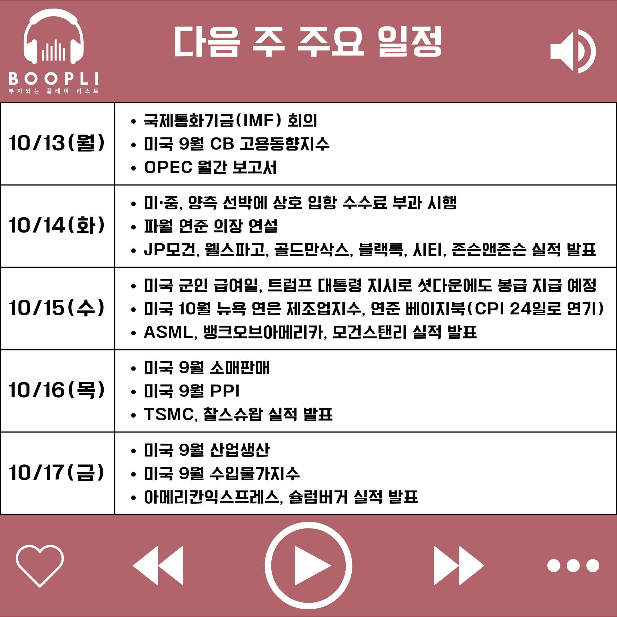 다음 주 미국 증시는 미·중 무역 분쟁의 추가 대응, 연방정부 셧다운의 지속 여부, 그리고 3분기 실적 시즌 개막이 핵심 변수로 작용할 전망이다.