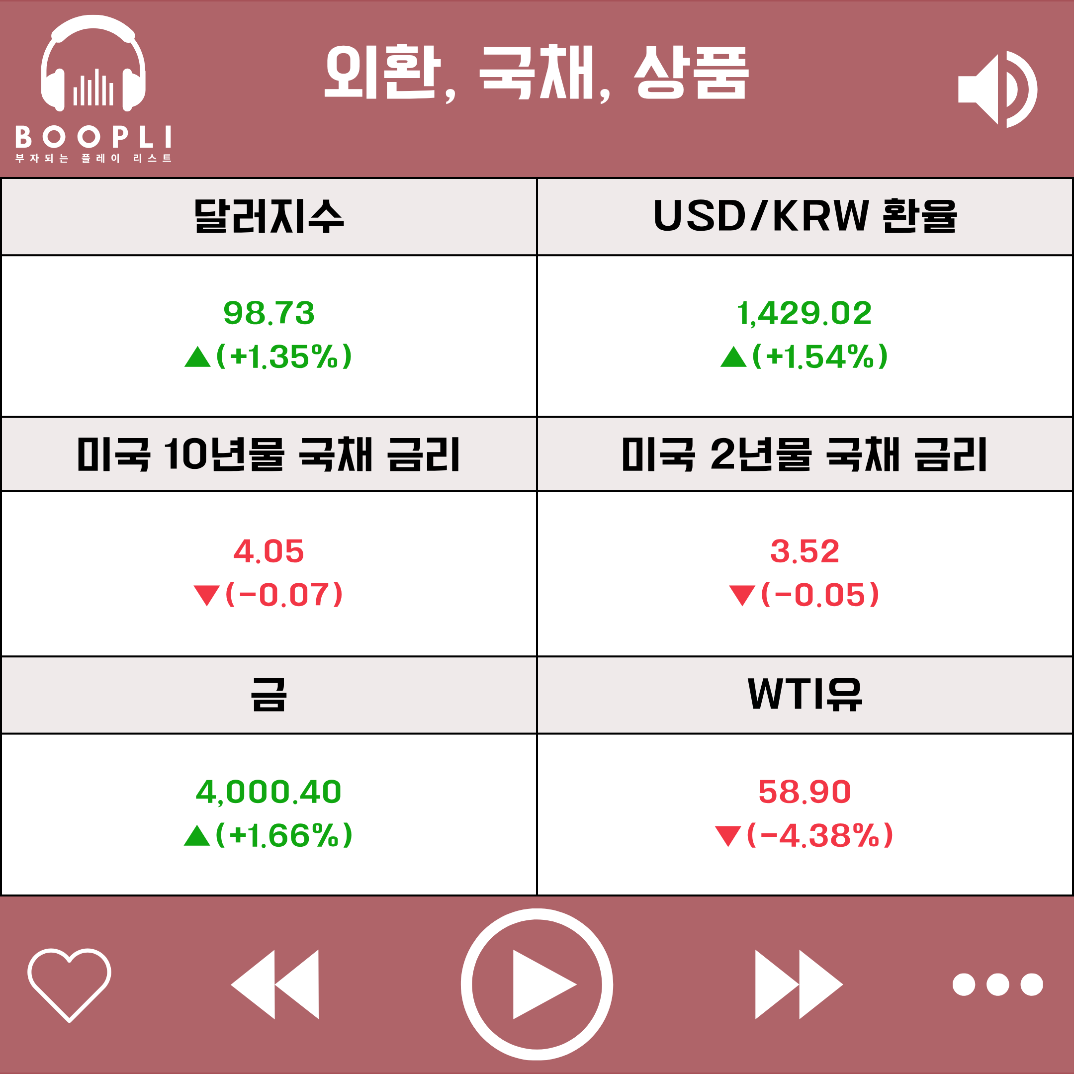 금리 인하 기대와 안전 자산 수요로 금 가격은 상승했고, OPEC+ 증산과 트럼프의 대중 관세 강화 발언으로 국제 유가인 WTI유 가격은 급락했다.