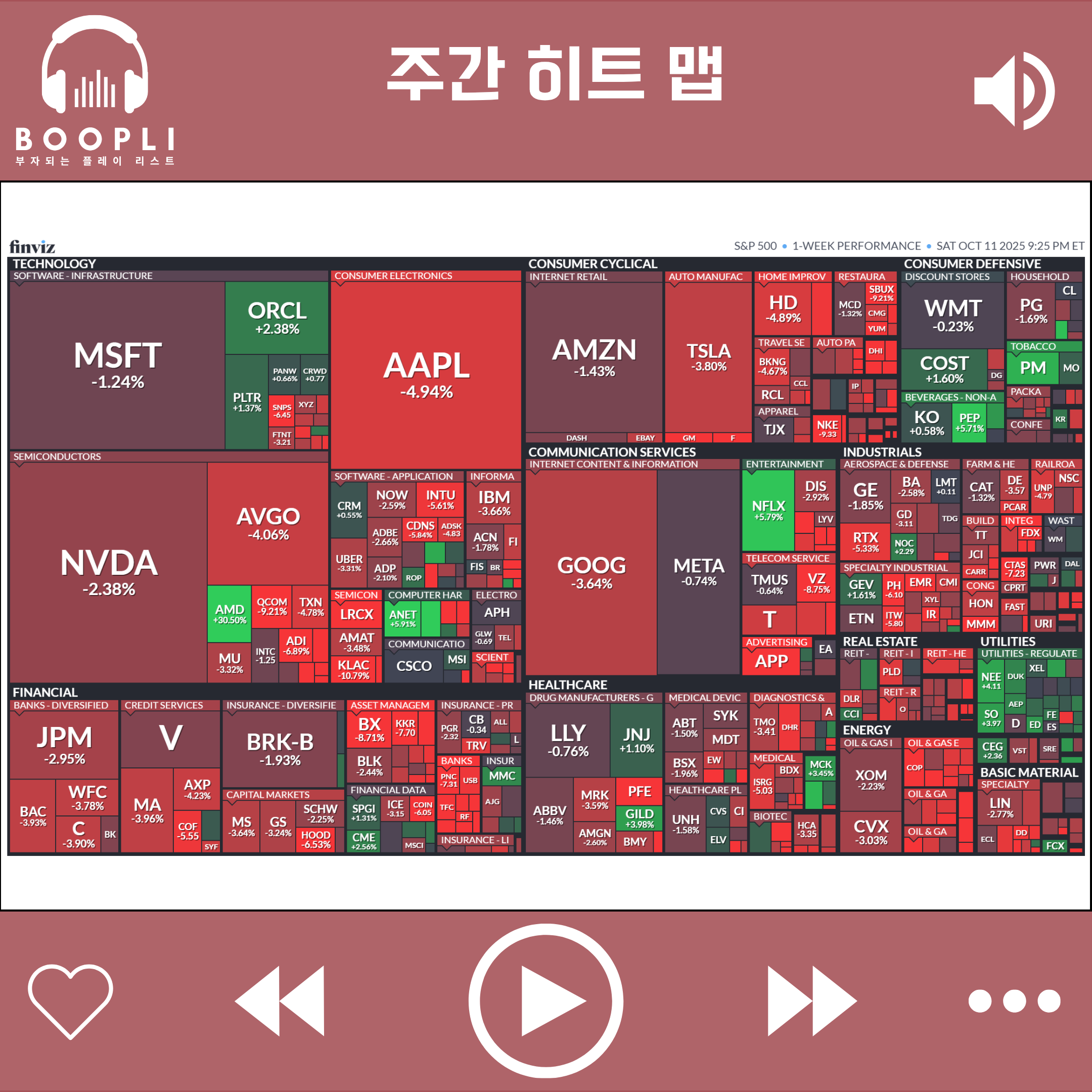 이번 주에는 연방정부 셧다운이 지속되는 가운데 AI 랠리에 대한 피로감과 미·중 무역 분쟁 재점화로 인해 유틸리티 섹터를 제외한 대부분 섹터가 하락했다.