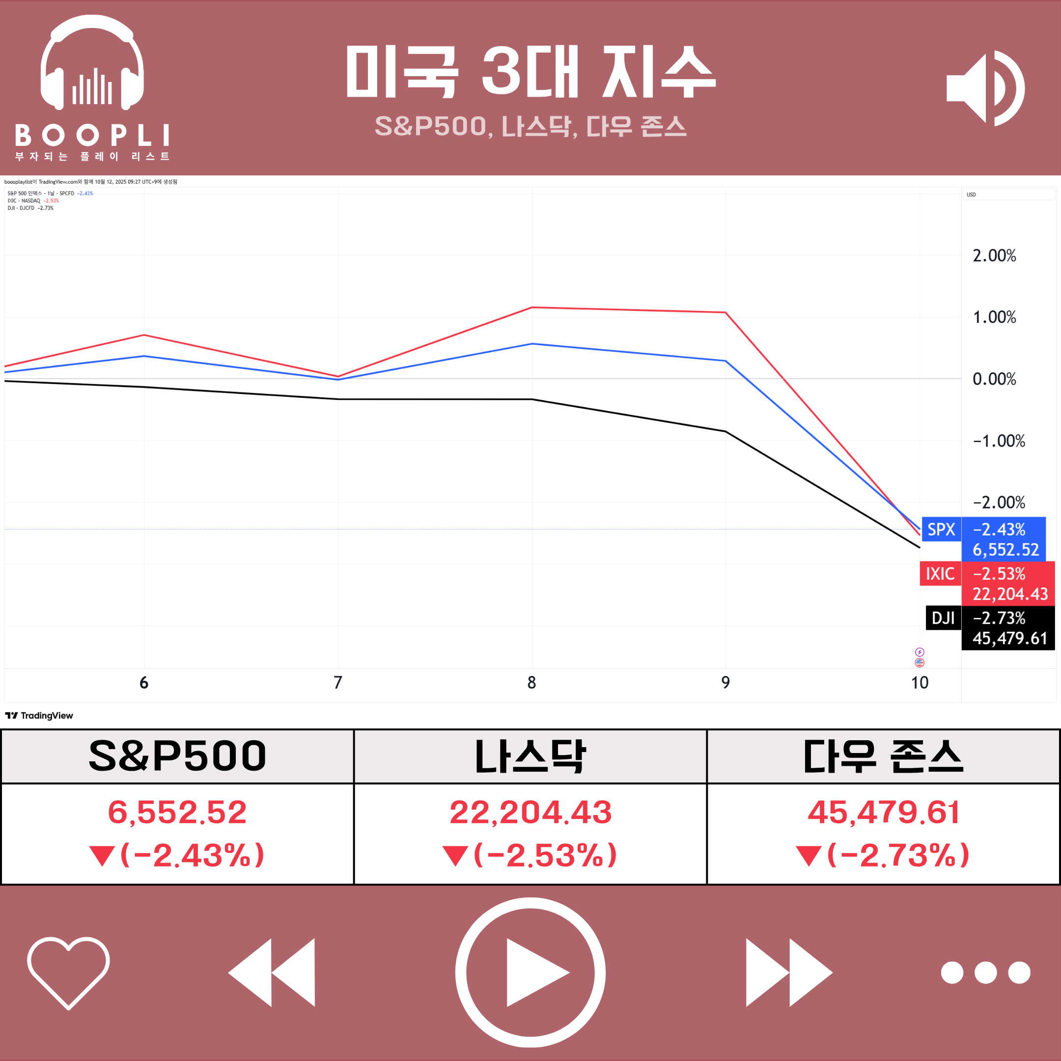 이번 주 미국 증시는 일본·프랑스의 정치 불확실성과 미·중 무역 갈등 심화, 연방정부 셧다운 장기화 등 글로벌 지정학적 불안 요인 속에서 투자 심리가 위축되며 3대 지수 모두 큰 폭으로 하락 마감했다.