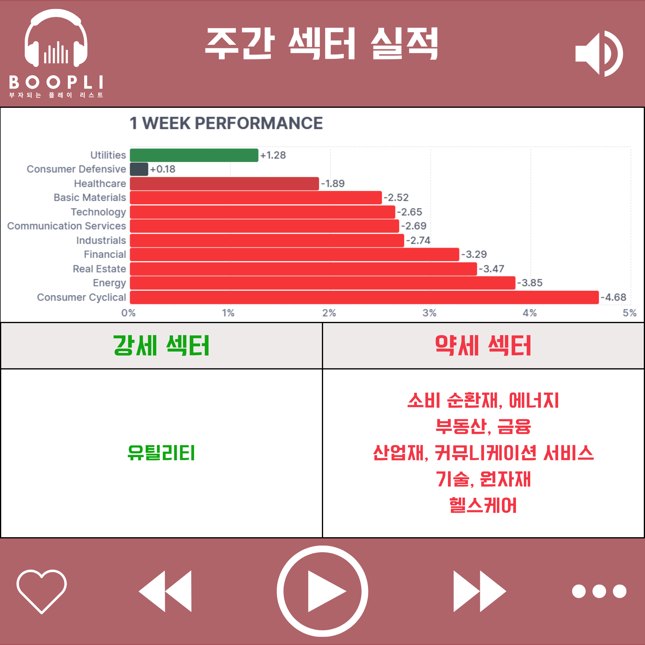 소비 순환재 섹터가 하락을 주도했으며, 이어서 에너지, 부동산, 금융, 산업재, 커뮤니케이션 서비스, 기술, 원자재, 헬스케어 순으로 약세를 보였다.